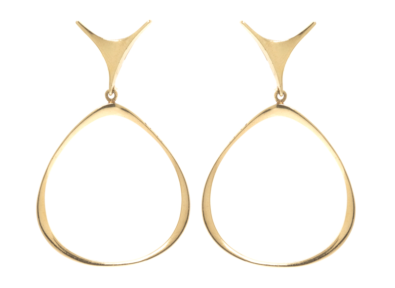 in an abstract sculpted gold design suspending an ovoid shape hoop. Stamp: 14K EW.