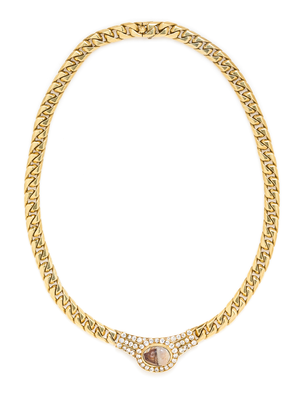 consisting of a pendant containing an oval agate cameo from the second century A.D. set within a bezel setting and hinged bail containing 44 round brilliant and single cut diamonds weighing approximately 1.76 carats total.Pendant hand inscribed: AGATE CAMEO II CENT A.D. Clasp stamp: BVLGARI BU984 18Kt.