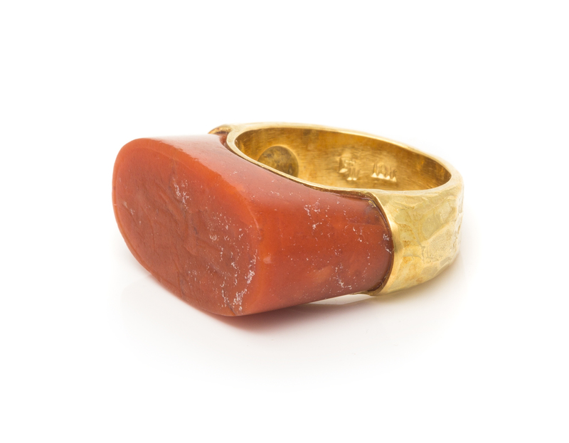 the raised saddle cut carnelian with carved intaglio top set within a hammered texture ring base.Stamp: 18K (maker's mark EW).Accompanied by a case signed Ed Wiener.
