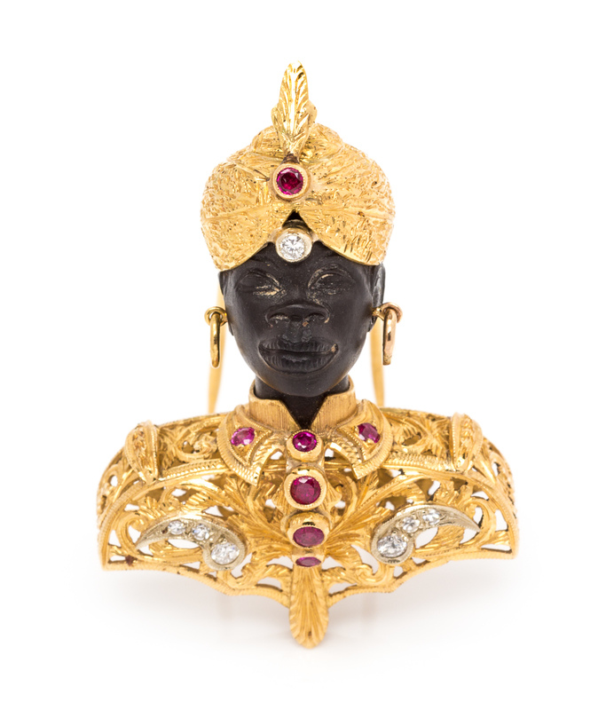 the bust and turban in an intricate openwork design with engraved detail, containing three round brilliant cut diamonds weighing approximately 0.12 carat total, four round single cut diamonds weighing approximately 0.04 carat total, and seven round mixed cut rubies weighing approximately 0.34 carat total, carved ebony face.Stamp: 750.