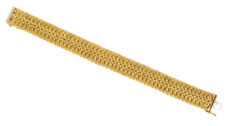 in a textured meshwork design, the top divided into two domed rows, the bracelet measuring approximately 15.90 mm wide.Stamp: Marchisio (maker's mark 195 TO) 750.