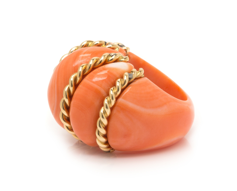 attributed to Seaman Schepps, consisting of a pinkish orange carved coral ring in a triple dome design enhanced with twisted rope texture gold wirework.
