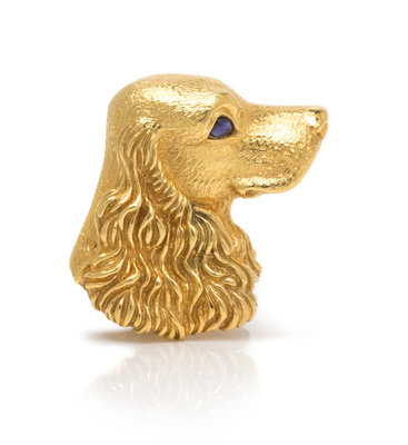 in an intricately textured cocker spaniel motif, containing one round cabochon cut sapphire eye.Stamp: TIFFANY & CO. 1989 GERMANY 750.