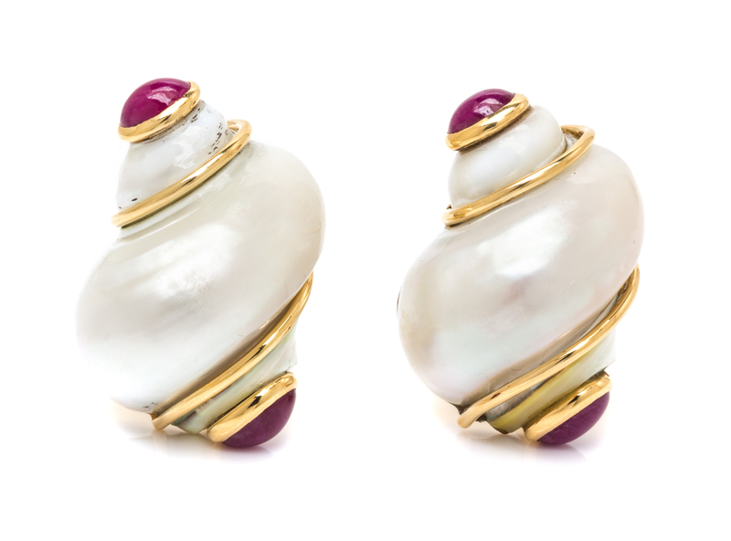A Pair of 18 Karat Yellow Gold, Shell and Ruby Earclips, Seaman Schepps,