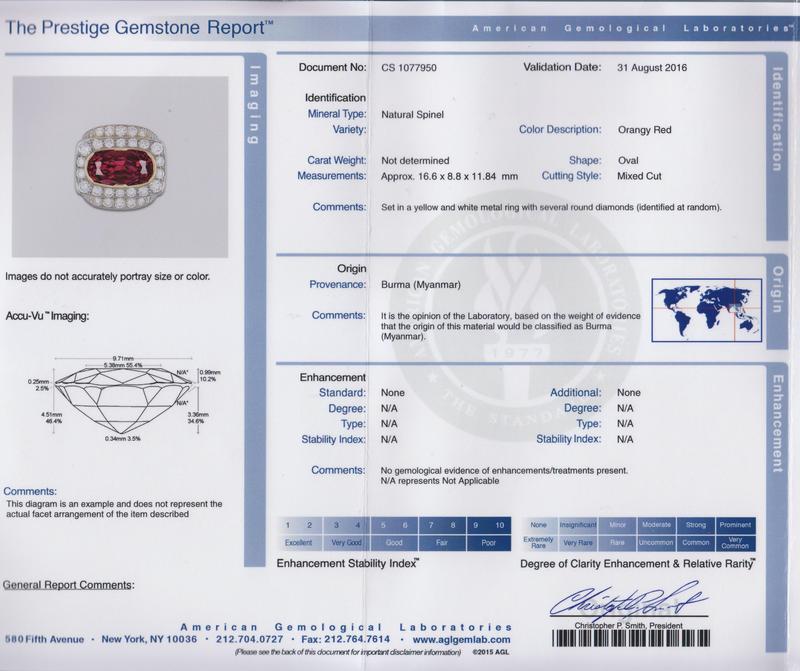containing one oval mixed cut orangey red spinel measuring approximately 16.60 x 8.80 x 11.84 mm and 48 round brilliant cut diamonds weighing approximately 2.43 carats total. Stamp: 14K (star shape maker's mark).Accompanied by an American Gemological Laboratories spinel identification and origin certificate number CS 1077950, dated August 31, 2016, stating Mineral Type: Natural Spinel, Variety: Spinel, Origin: Burma (Myanmar), Enhancement: No gemological evidence of heat, Clarity Enhancement: None.