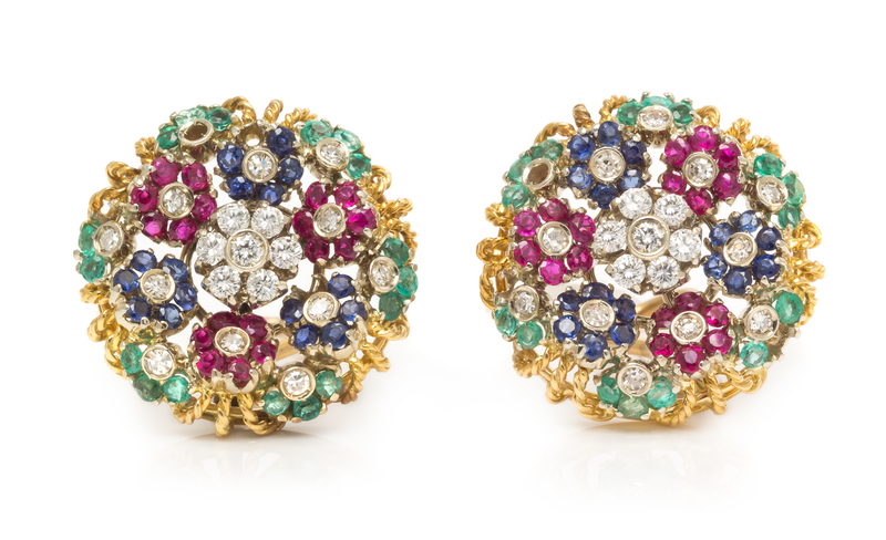 A Pair of Bicolor Gold, Diamond and Multigem En Tremblant Earclips,