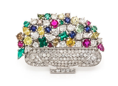 in a flowering basket motif, containing 99 round brilliant and single cut diamonds weighing approximately 3.00 carats total, five baguette cut diamonds weighing approximately 0.20 carat total, seven round and marquise cut yellow diamonds weighing approximately 1.65 carats total, four round and marquise cut brown diamonds weighing approximately 0.50 carat total, two pear shape green diamonds weighing approximately 0.40 carat total, six round and pear shape rubies weighing approximately 1.25 carats total, five round mixed cut sapphires weighing approximately 1.20 carats total, and seven round, octagonal step cut and marquise shape cabochon cut emeralds weighing approximately 1.30 carats total.Stamp: PLAT.NOTE: The colored diamonds in this brooch have not been tested to determine the origin of color.