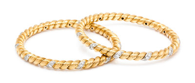 A Pair of 18 Karat Yellow Gold, Platinum and Diamond Bangle Bracelets, Van Cleef & Arpels, France,