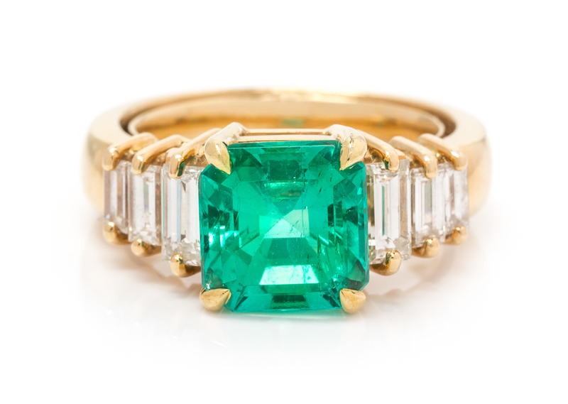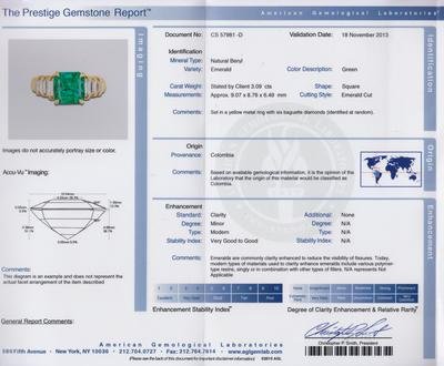 containing one octagonal step cut emerald weighing approximately 3.09 carats and six baguette cut diamonds weighing approximately 1.10 carats total.Stamp: 18K.Accompanied by an American Gemological Laboratories emerald identification and origin certificate number CS 57981, dated November 18, 2013, stating Mineral Type: Natural Beryl, Variety: Emerald, Origin: Colombia, Clarity Enhancement: Minor, Type: Modern.