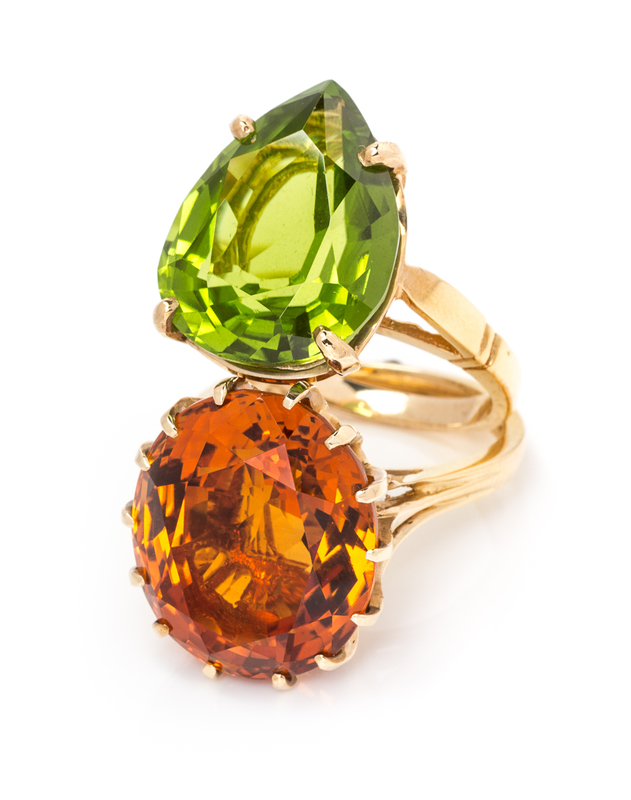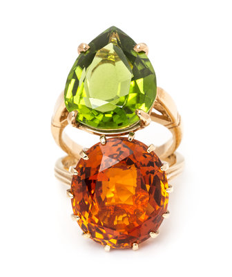 consisting of a ring containing one oval mixed cut citrine weighing approximately 15.82 carats, together with a ring containing a pear shape peridot weighing approximately 12.50 carats.