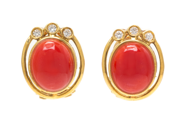 A Pair of 18 Karat Yellow Gold, Coral and Diamond Earclips,