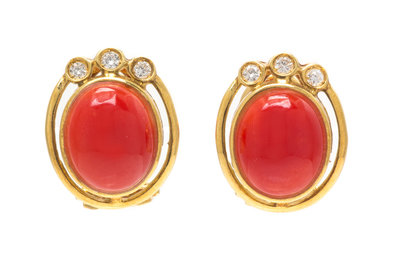 containing two oval cabochon cut orange red coral measuring approximately 12.45 x 10.45 mm and six round brilliant cut diamonds weighing approximately 0.25 carat total.Stamp: 750.
