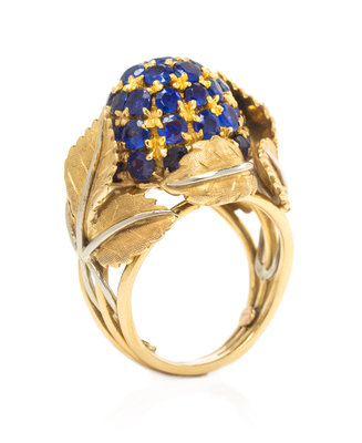 consisting of a central pave set dome containing numerous round mixed cut sapphires weighing approximately 2.30 carats total within a leaf motif surround composed of white gold "veins" and intricately textured yellow gold leaves above the trifurcated base.Stamp: 18ct ITALY.
