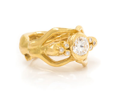 composed of two sculpted female nude figures forming the ring base and containing one round brilliant cut diamond weighing approximately 1.01 carats and six round brilliant cut diamonds weighing approximately 0.09 carat total.Stamp: 750 (MCD maker's mark).