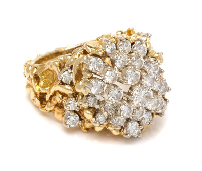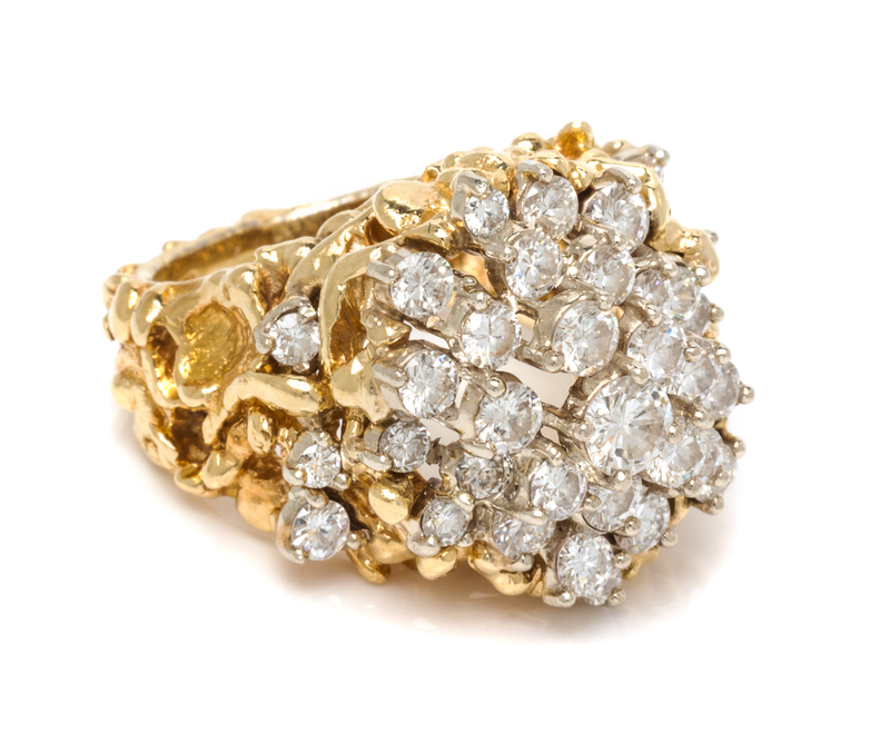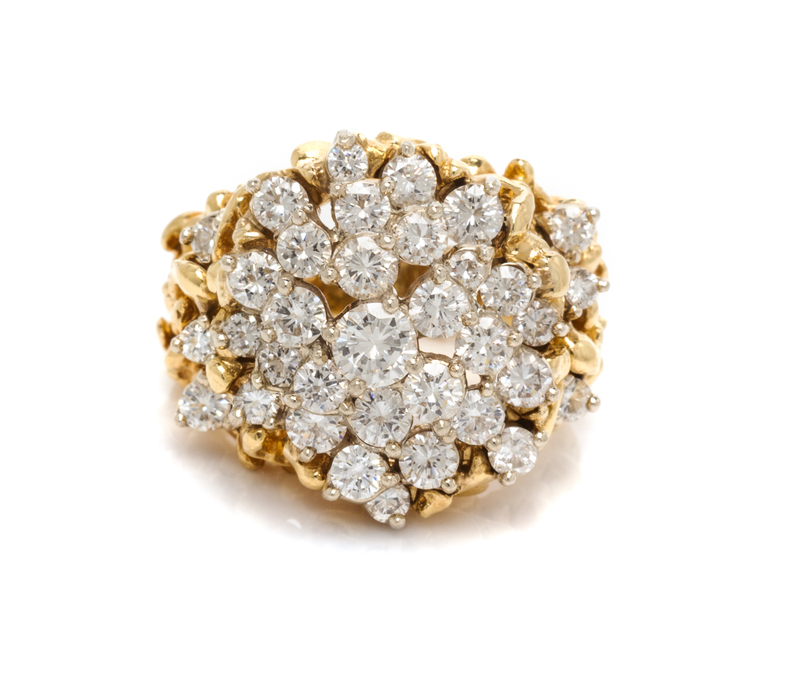 in a yellow gold nugget texture design with central white gold openwork cluster containing 35 round brilliant cut diamonds weighing approximately 2.74 carats total.