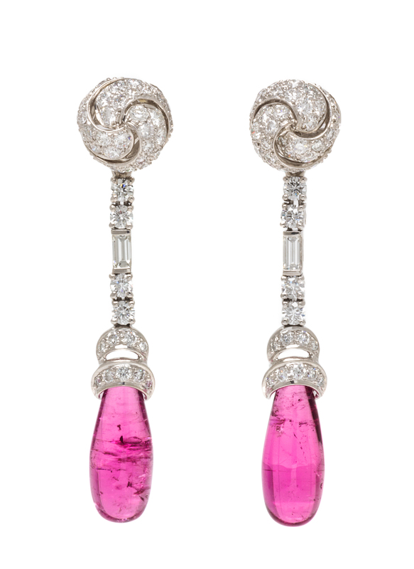 containing 66 round brilliant cut diamonds weighing approximately 1.56 carat total, 26 round brilliant cut diamonds and two baguette cut diamonds weighing 0.54 carat total, and two rubellite tourmaline drops weighing approximately 14.54 carats total.Stamp: VERDURA PT.