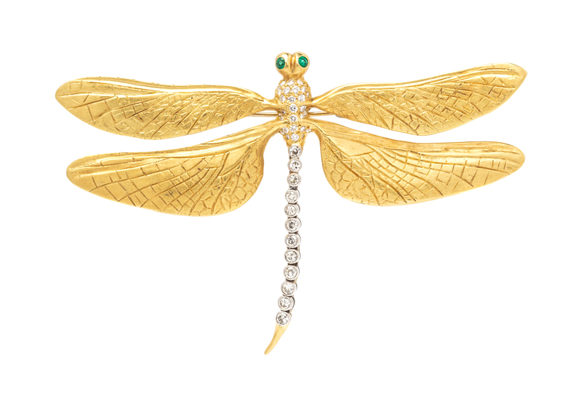An 18 Karat Yellow Gold, Platinum, Diamond and Emerald Dragonfly Brooch,