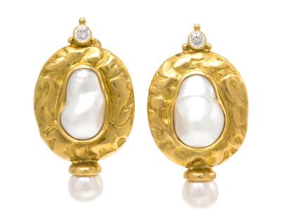 A Pair of 18 Karat Yellow Gold, Cultured Pearl and Diamond Earclips, Elizabeth Gage,