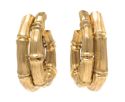 consisting of a joined double hoop design with carved bamboo motif.Stamp: Cartier 750 657903 (French assay and maker's mark).