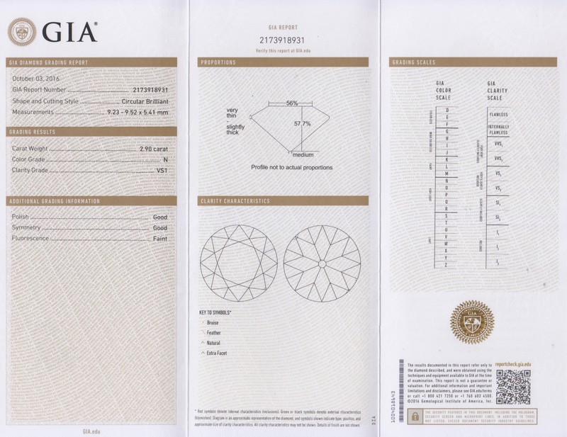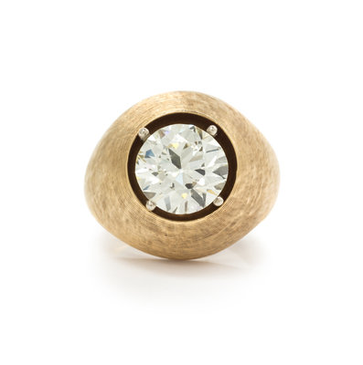 in a textured dome design with central recess containing one old European cut diamond weighing approximately 2.90 carats.Stamp: 14K (Obscured Maker's Mark).Accompanied by a Gemological Institute of America diamond grading certificate number 2173918931, dated October 03, 2016, stating Color: N, Clarity: VS1, Polish: Good, Symmetry: Good, Fluorescence: Faint.