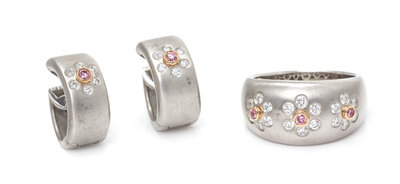 A Platinum, 18 Karat Rose Gold, Pink Diamond and Diamond Floral Motif Demi Parure, Suna,