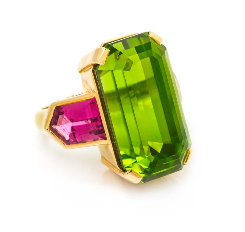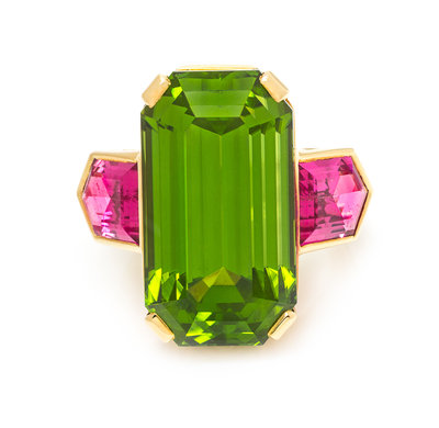 in a three stone design containing one octagonal step cut peridot weighing approximately 43.41 carats accented with two bullet shape step cut pink tourmaline weighing approximately 5.06 carats total.Stamp: 18K FP.