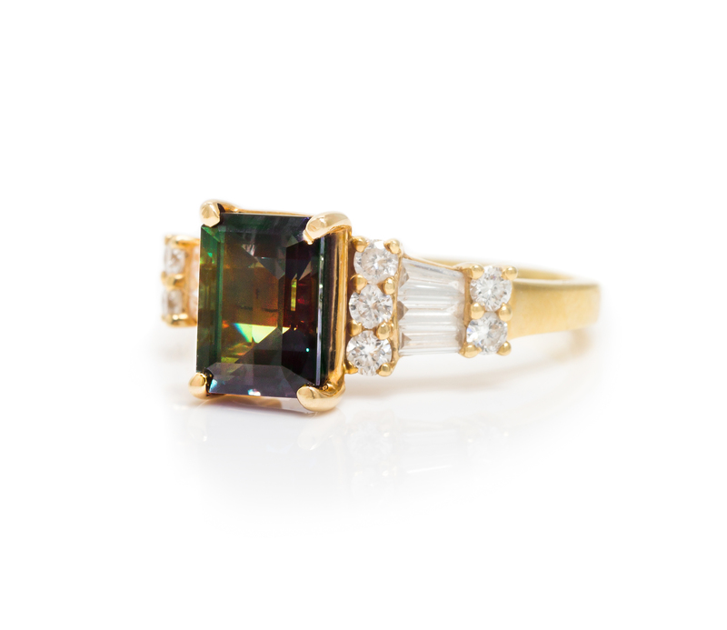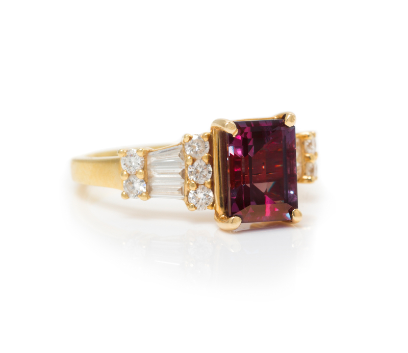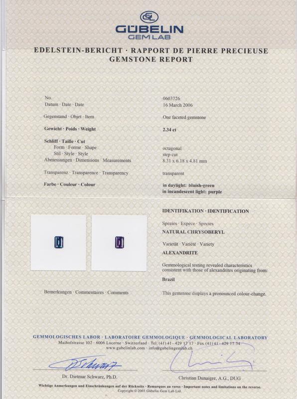 containing one octagonal step cut alexandrite weighing approximately 2.34 carats, 10 round brilliant cut diamonds weighing approximately 0.30 carat total and six tapered baguette cut diamonds weighing approximately 0.38 carat.Stamp: 18KT.Accompanied by a Gubelin Gem Lab alexandrite origin certificate number 0603726, dated March 16, 2006, stating Species: Natural Chrysoberyl, Variety: Alexandrite, Origin: Brazil, Comments: This gemstone displays a pronounced colour-change.