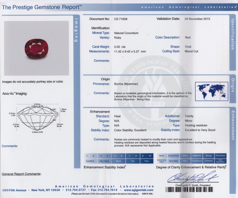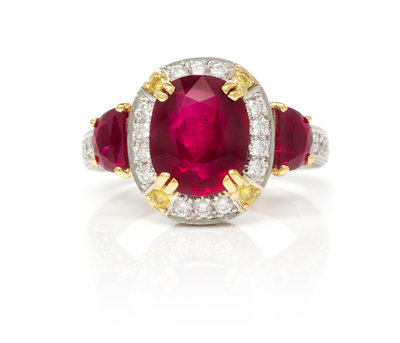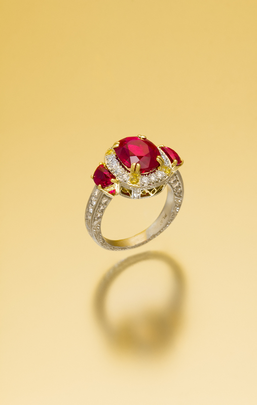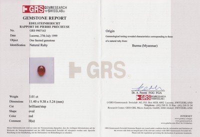 containing an oval mixed cut ruby weighing approximately 5.01 carats total, two half moon mixed cut rubies weighing approximately 1.60 carats total, four round brilliant cut yellow diamonds (origin of color not tested) weighing approximately 0.12 carat total, and numerous round brilliant cut diamonds weighing approximately 0.93 carat total.Stamp: BEAUDRY PLAT.Accompanied by a Gem Research Swisslab (GRS) gemstone certificate number GRS9907163, dated July 27, 1999, stating: Natural Ruby, Weight: 5.01 Carats, Origin: Burma (Myanmar), Comments: Indications of thermal treatment.Accompanied by an American Gemological Laboratories ruby identification and origin certificate number CS 71658, dated November 24, 2015, stating Mineral Type: Natural Corundum, Variety: Ruby, Origin: Burma, Enhancement: Heat, Clarity Enhancement: Minor.