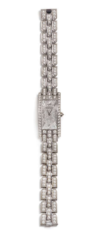 the bezel, crown, lugs and bracelet containing numerous round brilliant cut diamonds weighing approximately 5.40 carats total, 39.00 x 19.00 mm case dimensions, the dial pave set with numerous round single cut diamonds and signed HARRY WINSTON, engraved Arabic and baton numerals, silvered baton hands, curved rectangular case, case back affixed with four screws, quartz movement, brick link bracelet, double deployant clasp.Case back stamp: HARRY WINSTON 330 LQW 009894 No633.