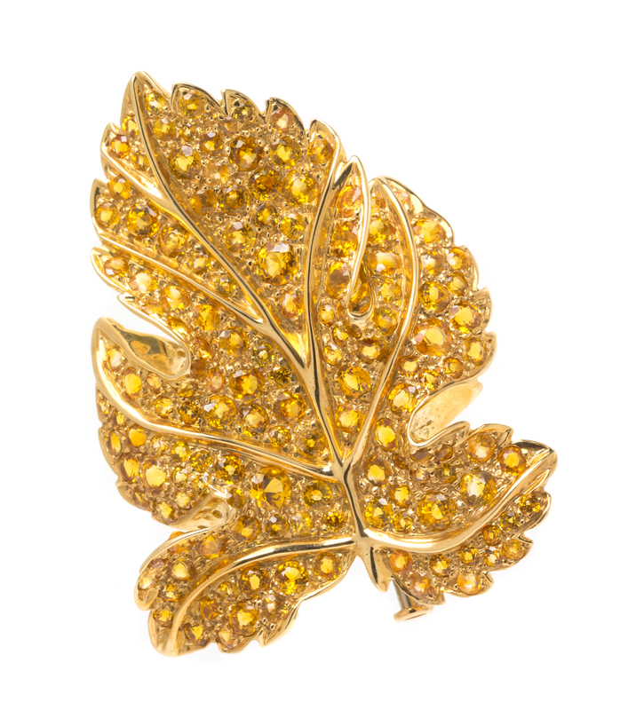 in a sculpted realistic leaf design pave set with numerous round mixed cut orange-yellow sapphires between the raised gold wirework "veins".Stamp: sabbadini milano 750 (obscured Italian maker's mark).