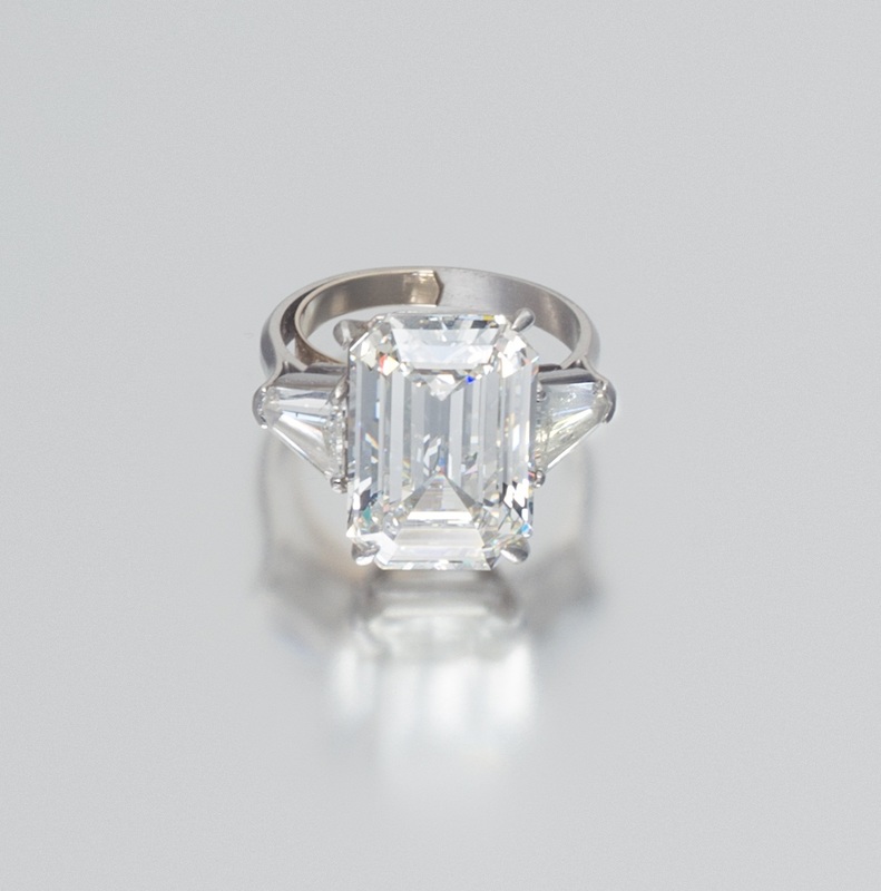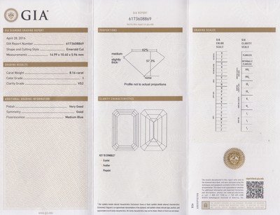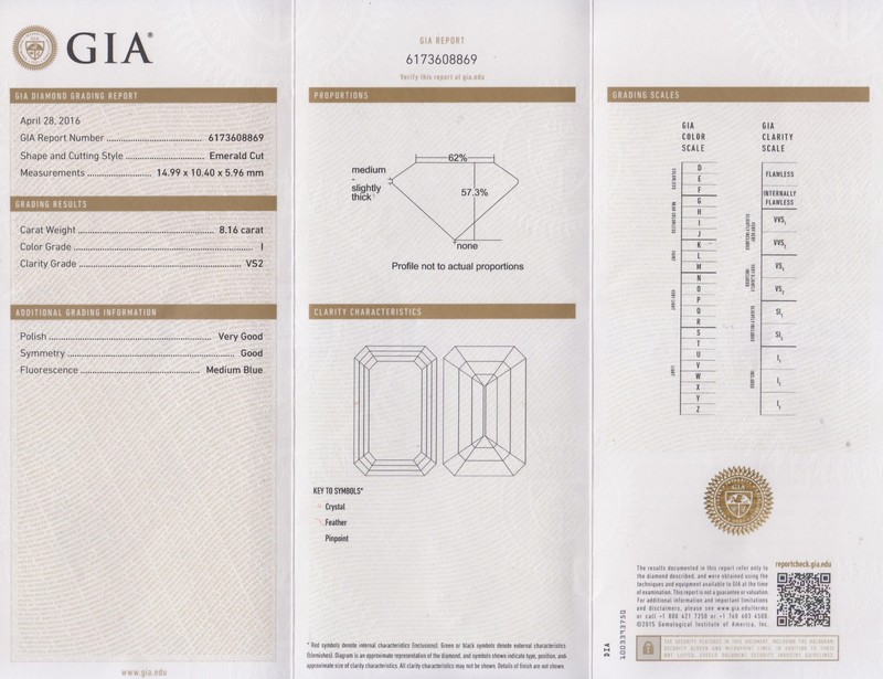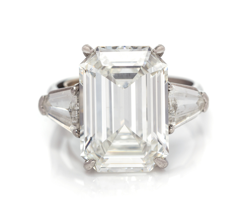 containing an octagonal step cut diamond weighing approximately 8.17 carats and two shield shape step cut diamonds weighing approximately 0.66 carat total.Accompanied by a Gemological Institute of America diamond grading certificate number 6173608869, dated April 28, 2016, stating Color: I, Clarity: VS2, Table: 62.00%, Depth: 57.30%, Polish: Very Good, Symmetry: Good, Fluorescence: Medium Blue.