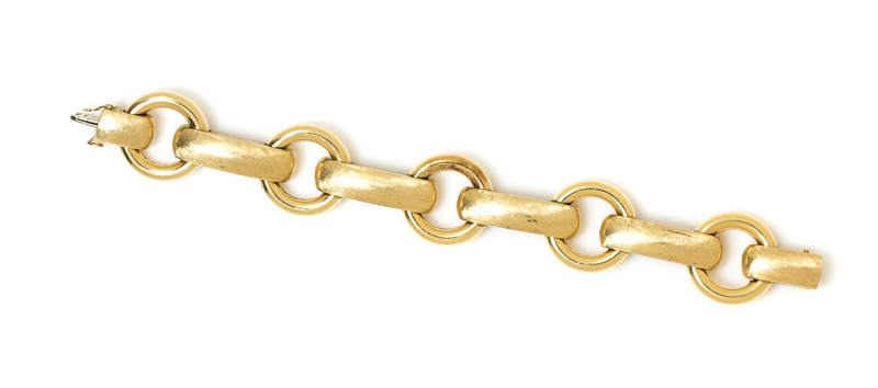 consisting of polished round links alternating with textured bar links, hidden clasp.Stamp: 750.