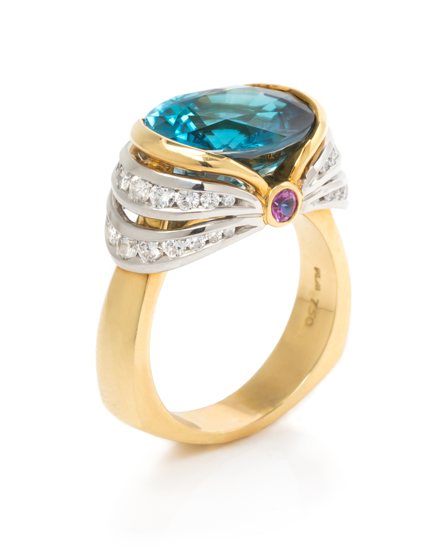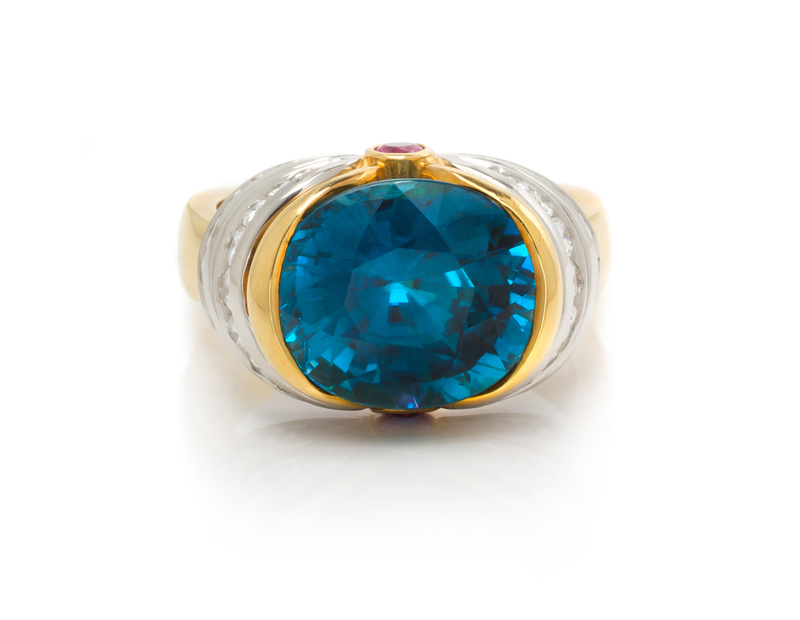 An 18 Karat Yellow Gold, Platinum, Blue Zircon, Diamond, and Pink Sapphire Ring, Krementz,