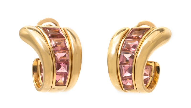 in an J-hoop design, containing 16 channel set calibre cut pink tourmalines.Stamp: VERDURA 750.