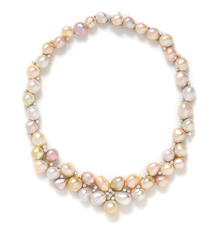 consisting of numerous baroque pearls measuring from approximately 10.00 x 10.00 mm up to 13.80 x 12.50 mm and in various hues (origin of color not tested) including silver white, pink, yellow, greenish yellow, purplish pink, and orangey pink, the pearls set on conforming white gold frame links with a foliate motif center, double row surround and single row back chain, the pearls interspersed with 43 round brilliant cut diamonds weighing approximately 2.65 carats total.Stamp: TGI 750 18K D2.65.