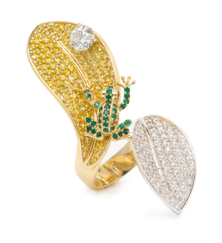 An 18 Karat Bicolor Gold, Color Diamond, Diamond and Emerald Frog and Leaf Motif Ring,