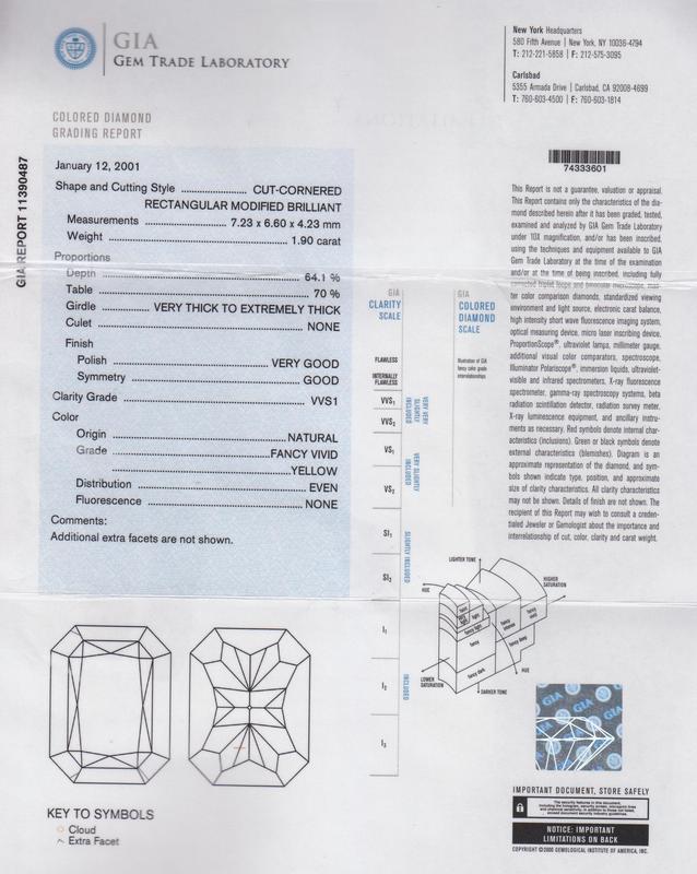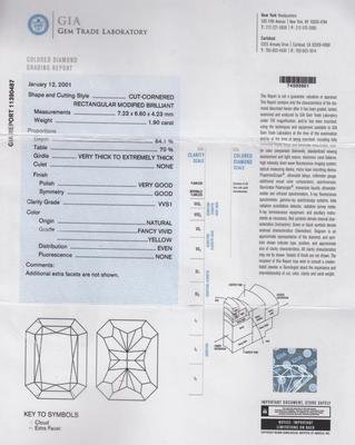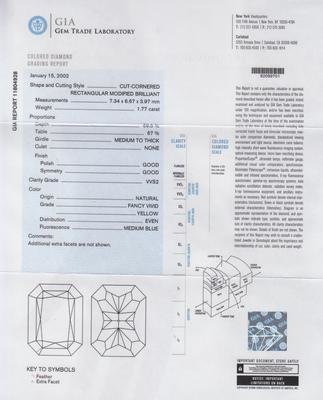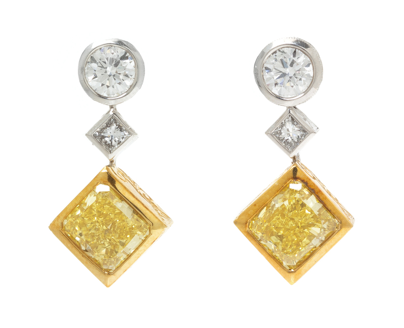 containing a radiant cut diamond weighing approximately 1.90 carat, and a radiant cut diamond weighing approximately 1.77 carat, and two princess cut diamonds weighing approximately 0.26 carat total, and two round brilliant cut diamonds weighing approximately 1.01 carat.Earrings Stamp: BEAUDRY PLAT 750.Accompanied by two Gemological Institute of America colored diamond grading certificates, numbered 11390487 and 11804928, dated January 12, 2001 and January 15, 2002, stating Weight: 1.90 and 1.77 carats, Color: Natural Fancy Vivid Yellow and Natural Fancy Vivid Yellow, Clarity: VVS1 and VVS2, Polish: Very Good and Good, Symmetry: Good and Good, Fluorescence: None and Medium Blue, all respectively.