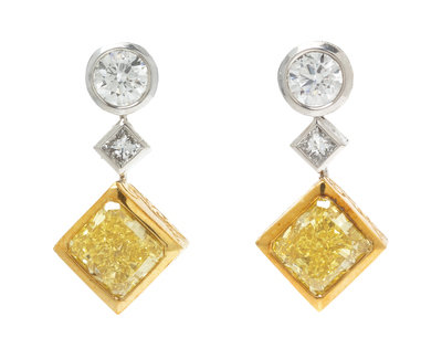 A Pair of Platinum, Yellow Gold, Yellow Diamond and Diamond Earrings, Micheal Beaudry,