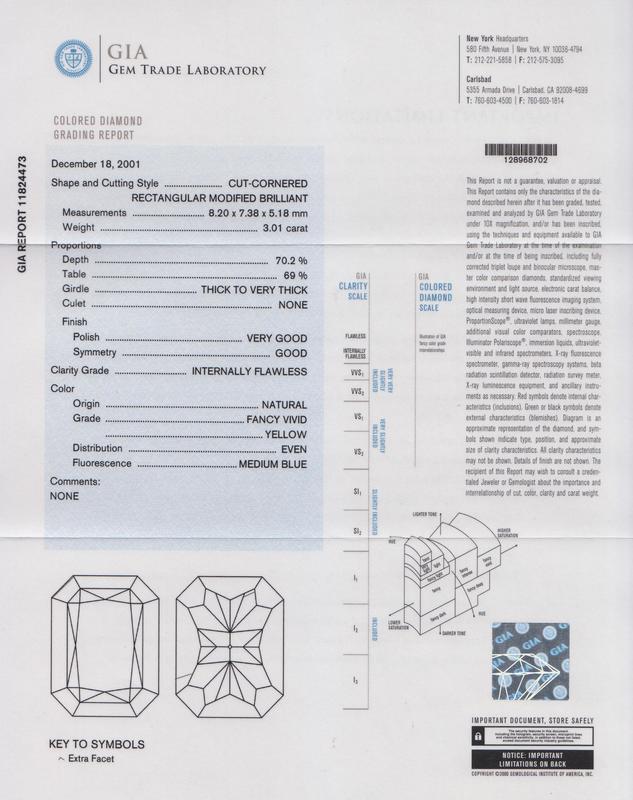 containing one radiant cut fancy vivid yellow diamond weighing approximately 3.01 carats, one princess cut diamond weighing approximately 0.13 carat, one round brilliant cut diamond weighing approximately 0.50 carat, and 50 round brilliant cut diamonds weighing approximately 2.78 carats total.Stamp: BEAUDRY PLAT 750.Accompanied by a Gemological Institute of America colored diamond grading certificate number 11824473, dated December 18, 2001, stating Weight: 3.01 carats, Color: Natural Fancy Vivid Yellow, Clarity: Internally Flawless, Polish: Very Good, Symmetry: Good, Fluorescence: Medium Blue.