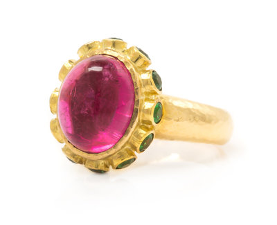 An 18 Karat Yellow Gold, Pink Tourmaline and Tsavorite Ring, Elizabeth Locke,