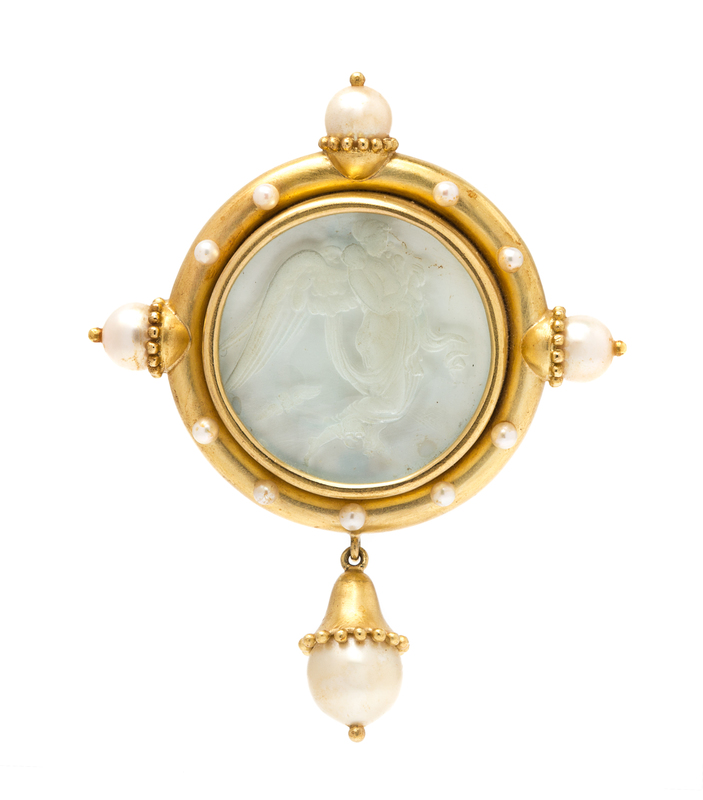 containing an intaglio depicting an angel holding an infant and measuring approximately 32.00 in diameter with a mother-of -pearl backing, three pearls measuring approximately 8.00 mm in diameter, one pearl measuring approximately 11.30 mm in diameter, and nine pearls measuring approximately 2.90-3.00 mm in diameter.Stamp: 18K (maker's mark).