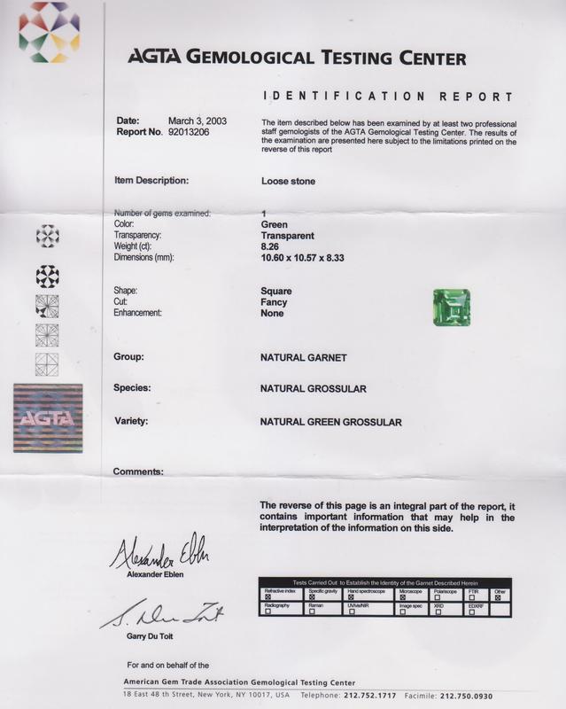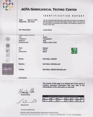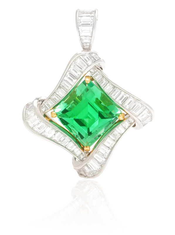containing one square modified cut mint green grossular garnet weighing approximately 8.26 carats, and 50 baguette cut diamonds weighing approximately 2.41 carats total.Hand inscribed: VAN CLEEF & ARPELLS SL516 PT950 750.Accompanied by a AGTA Gemological Testing Center garnet identification certification number 92013206, dated March 3, 2003, stating Species: Natural Grossular, Variety: Natural Green Gossular, Weight: 8.26 carats.
