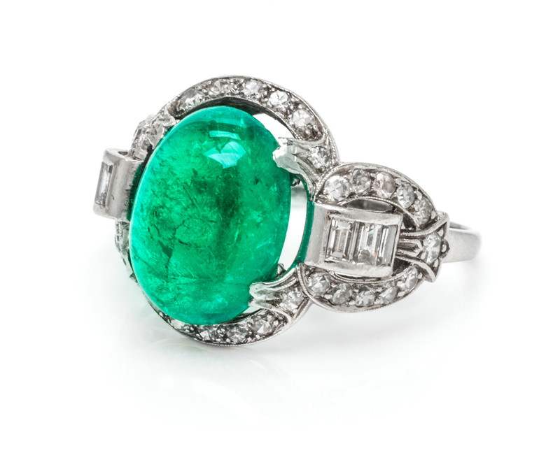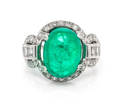 in an openwork design, containing an oval cabochon cut emerald weighing approximately 4.90 carats surrounded by 36 round single cut diamonds weighing approximately 0.36 carat total and six baguette cut diamonds weighing approximately 0.36 carat total, open filigree work gallery.Stamp: 10% IRID.