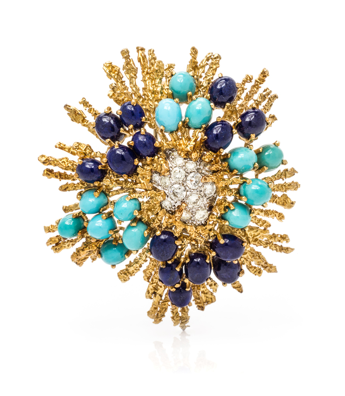 An 18 Karat Yellow Gold, Turquoise, Lapis Lazuli and Diamond Brooch,