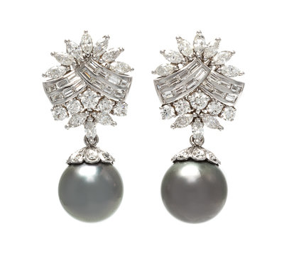 A Pair of 18 Karat White Gold, Diamond, and Cultured Tahitian Pearl Earclips, Tiffany & Co.,