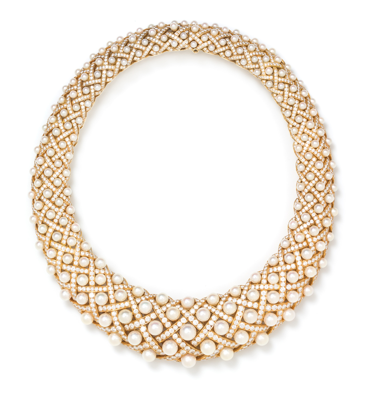 in a graduated collar design with open latticework detail, containing 1,308 round brilliant cut diamonds weighing approximately 43.00 carats total, and 193 pearls measuring approximately 3.50-9.00 mm in diameter, the necklace measuring approximately 18.80-35.00 mm wide.Stamp: CHANEL 10C412 750 (French assay and maker's marks).Accompanied by a copy of a Chanel evaluation certificate dated August 20, 2005.