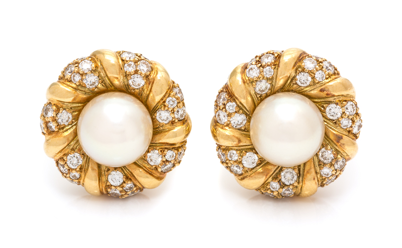 A Pair of 18 Karat Yellow Gold, Cultured Pearl and Diamond Earclips, Chanel,