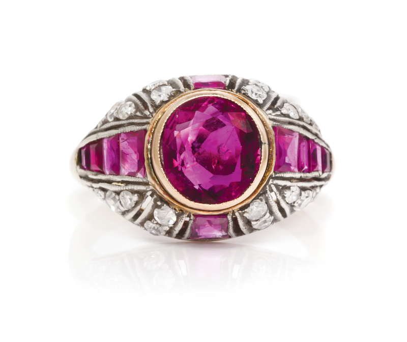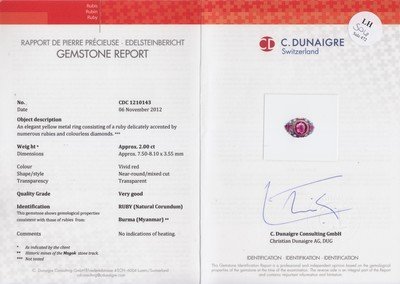 containing one round mixed cut ruby weighing approximately 2.00 carats, eight baguette cut rubies weighing approximately 0.78 carat total, two square step cut rubies weighing approximately 0.40 carat total and 20 round single cut diamonds weighing approximately 0.42 carat total.Accompanied by an C. Dunaigre ruby identification and origin certificate number CDC 1210143, dated November 6, 2012, stating Origin: Burma (Myanmar), Enhancement: No gemological evidence of heat.