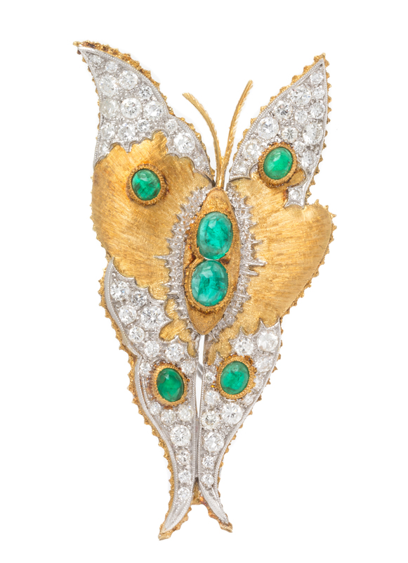 An 18 Karat Bicolor Gold, Emerald and Diamond Butterfly Brooch, Federico Buccellati,