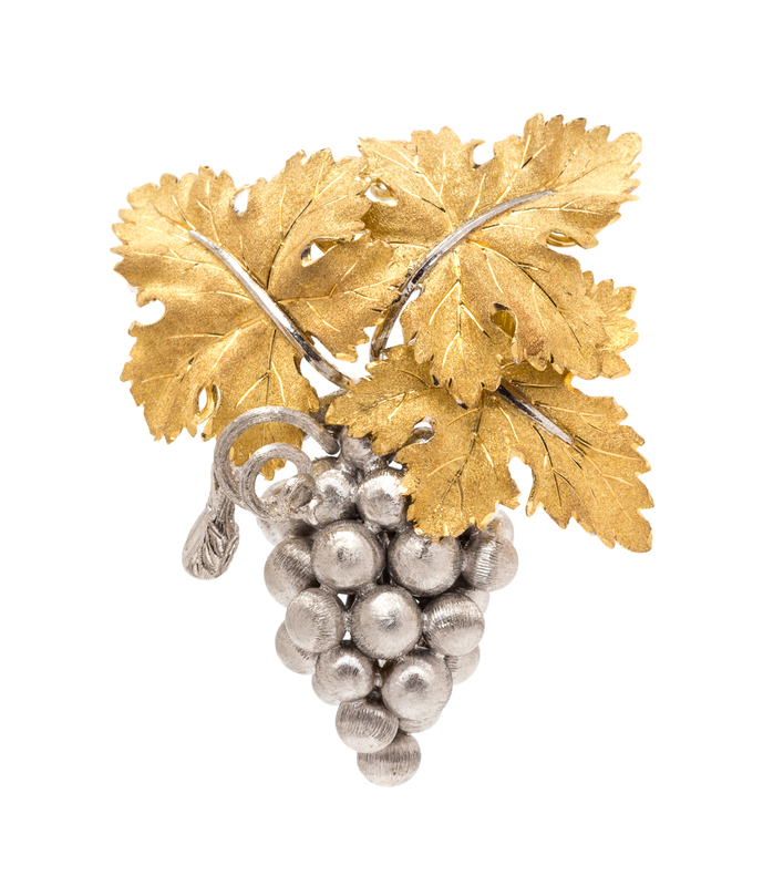 consisting of white gold textured grapes and vines together with yellow gold leaves.Hand inscribed: Buccellati ITALY 18K.